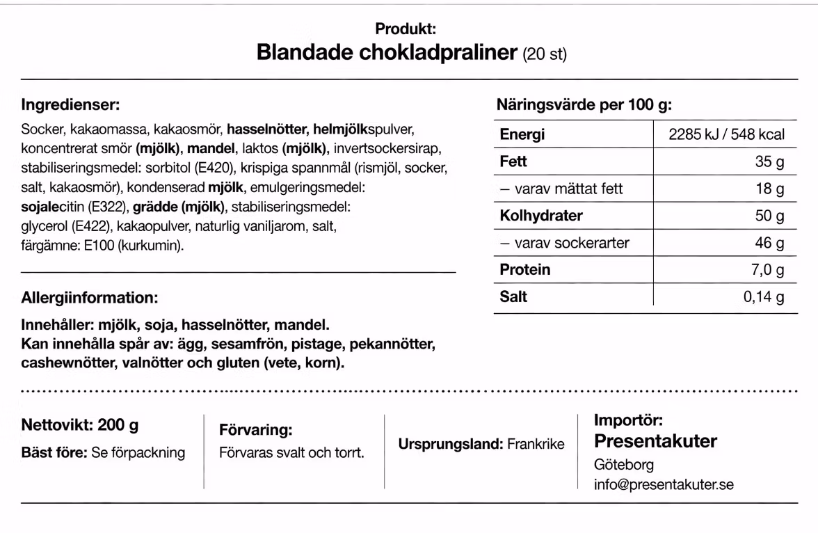 Kan innehålla spår av: ägg, sesamfrön, pistagenötter, pekannötter, cashewnötter, valnötter samt gluten (VETE, KORN).