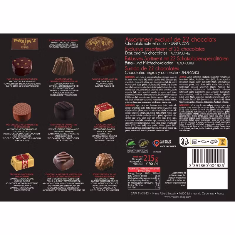 Fall för detta oemotståndliga sortiment av Maxims choklader med rent kakaosmör. Askens elegans, smakernas äkthet och kakaonens girighet kommer omedelbart att förflytta dig till ett ögonblick av sann njutning.